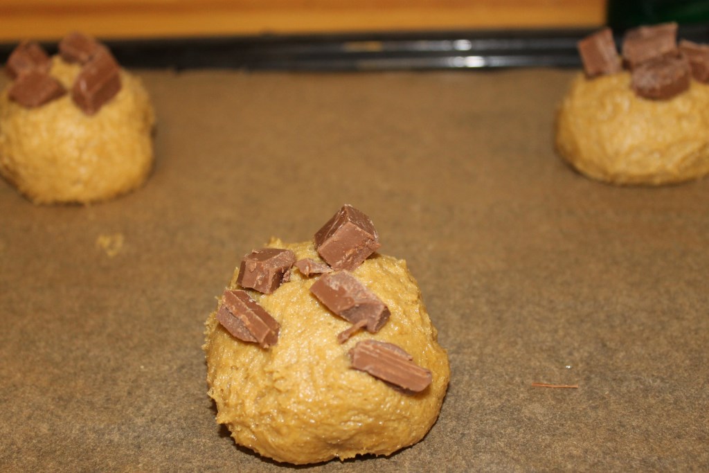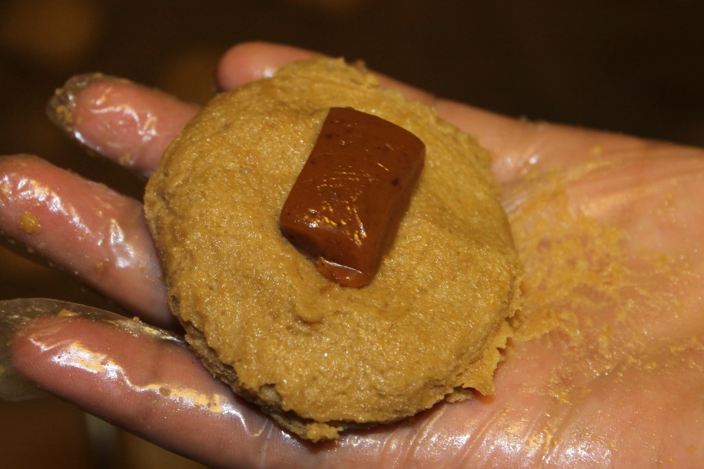 6. Fordel deigen i boller med en bit karamell i midten på ett bake brett.