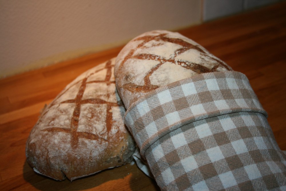 Til denne oppskriften trenger du: 800 g hvetemel 200 g sammalt rug 1 ss havsalt 500 g surdeig 6 ½ dl lunkent vann mel til pynt 1. Bland hvetemel, sammalt rug, havsalt og surdeig og vann, men hold igjen 1 dl vann til senere. 2. Elt deigen godt, når deigen er nesten ferdig eltet, tilsettes det siste… Fortsett å lese Saftig og godt brød