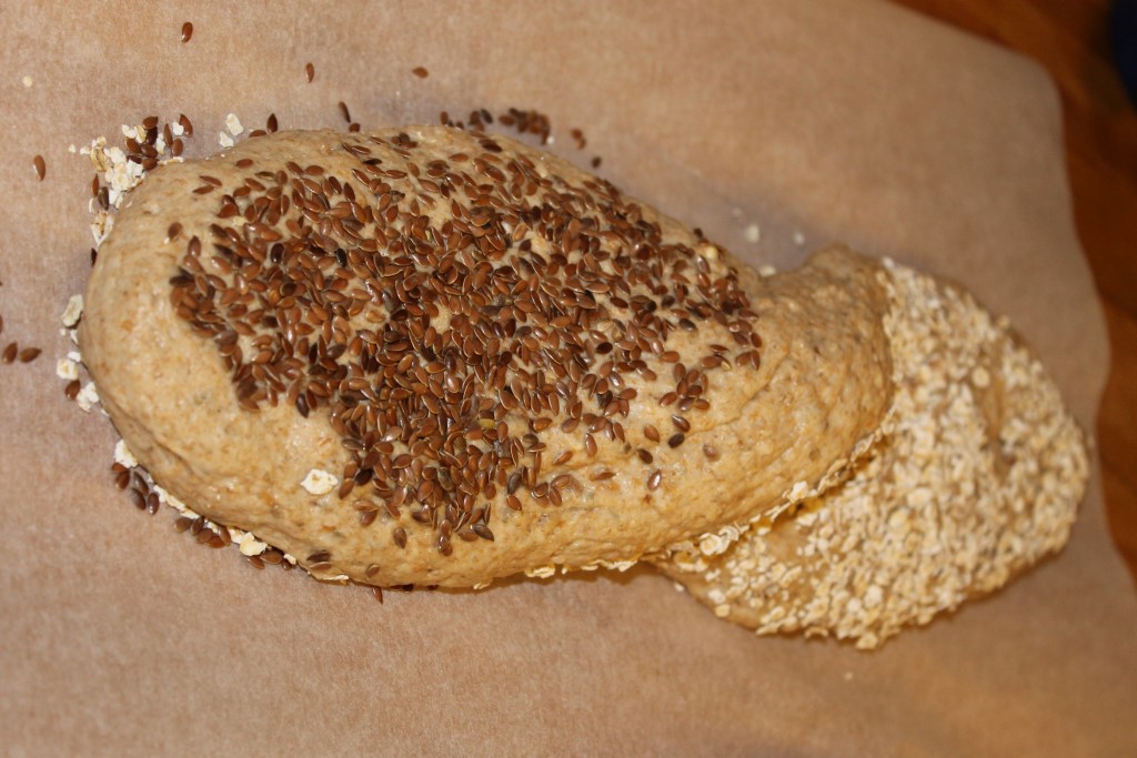 8. Ha havregryn på bordet og dypp ene siden på brødet og andre siden dypper du i litt linfrø, før du gir det en vri og legger på ett bakepapir på en bakeplate.