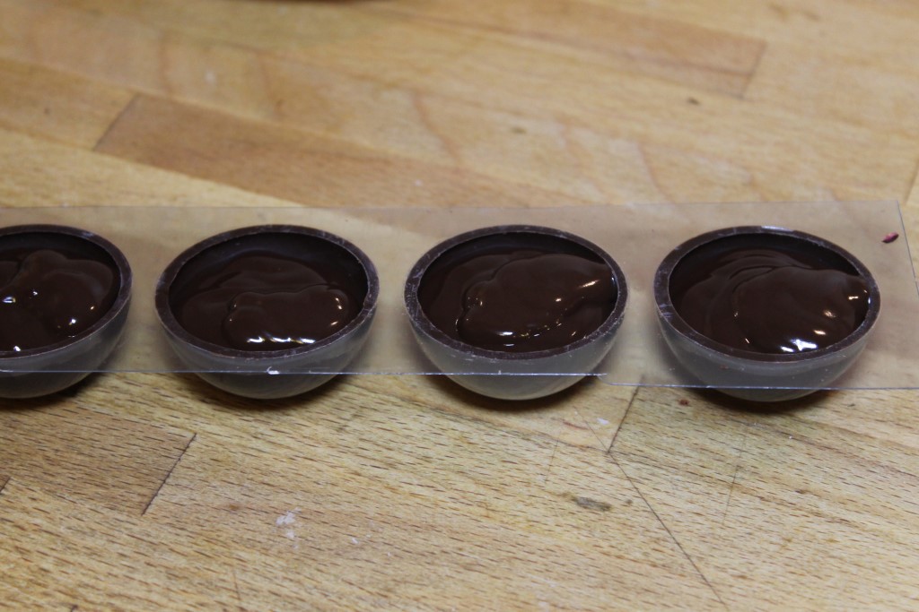 8.  Ha sjokoladen over formene så du stenger inn fyllet i konfekten.
