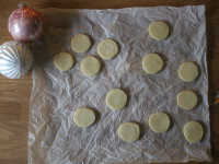 6. Skjær i 0,5cm tykke skiver og legg de på ett bakepapir.